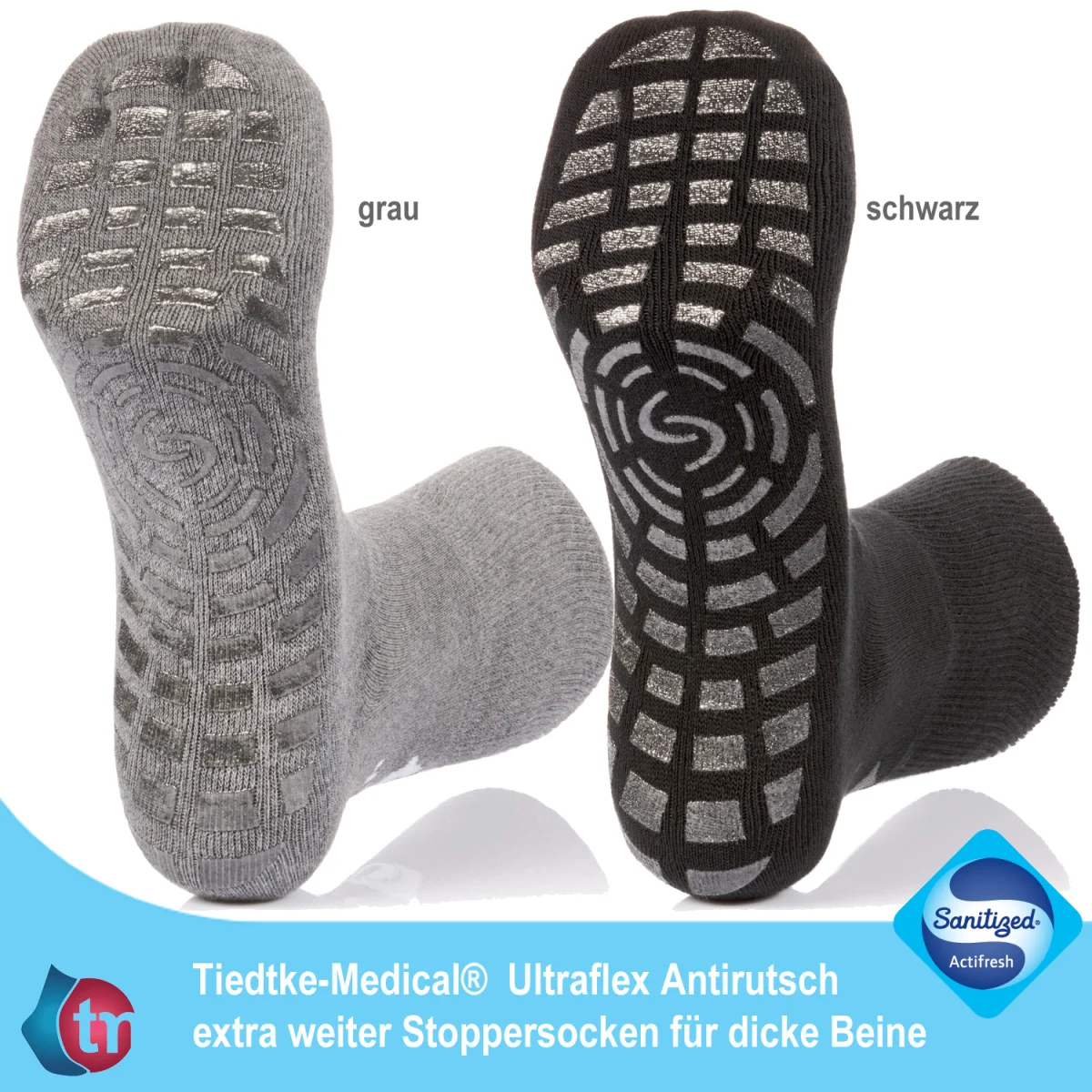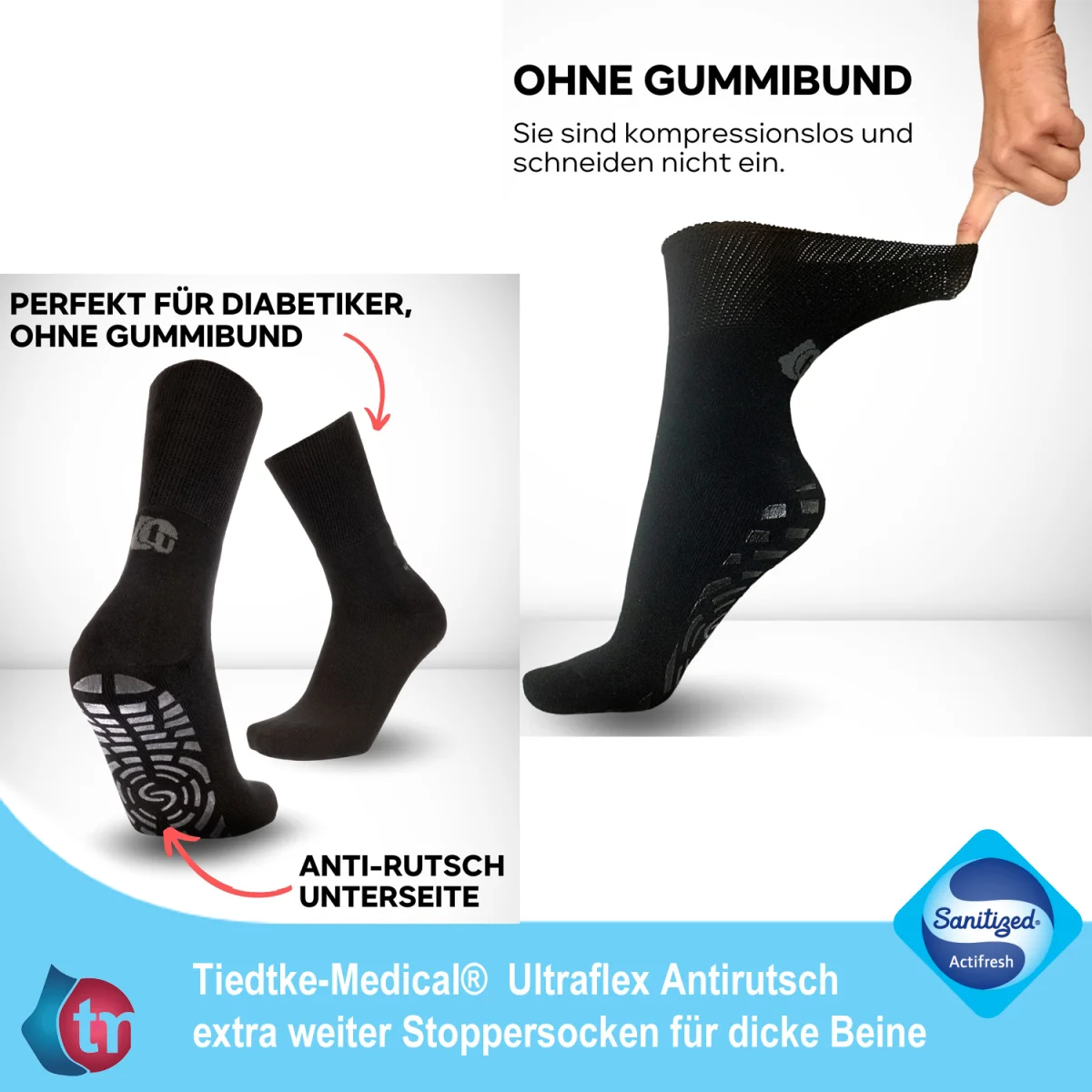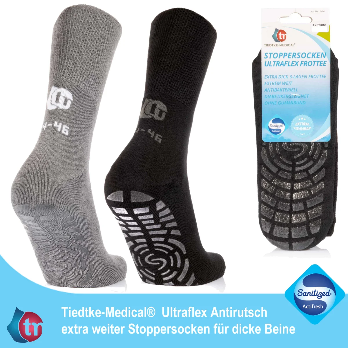 Die Ultraflex Frottee Antirutsch Stoppersocken sind ideal für Menschen, die einen Hausschuhersatz für den Heimbereich, oder den Aufenthalt in einer Klinik suchen. Dieser Antirutsch-Hausschuh-Strumpf basiert auf unserem Ultraflex Frotte Socken, welcher speziell für dicke und geschwollene Beine entworfen wurde.