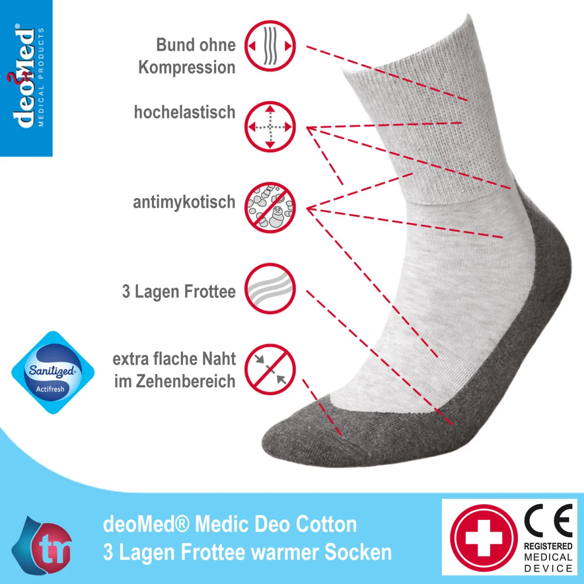 Die weiten Socken ohne Naht im Bund, eignen sich durch die besonders weiche Verarbeitung auch bei druckempfindliche Füßen. Die Socken sind auch für Lip- und Lymphödem Patienten geeignet. Mit dem speziellen SANITIZED Prinzips werden antibakterielle und antifugale Fasern eingearbeitet, diese wirken der Bildung von Bakterien und damit der Entstehung von Fußgeruch entgegen.